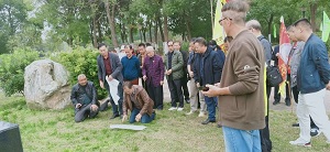 饭后李馆长带宗亲们去参观了荆州机场,新机马上投入使用,离岑参故居才一公里多路程。又带大家去参故岑参故居所属的行政村广场和村部,岑河镇东湖村。下午天公不作美,下起了小雨,徐书记带着岑氏宗亲一行观看了所赠地地的方位和走向,现场和大家讨论。岑氏宗亲们对地块的方位地理位置很满意。随后又来到岑督都亭遗址,当地的一位老农说,解放前这里还有石碑之类的,文化大革命时期用推土机都推到深潭里面了,现在都成了稻田,按照当地人的回忆的方位,宗亲们找来铁锹锄头除草,买来香蜡纸钱就地祭奠,告慰先祖。
